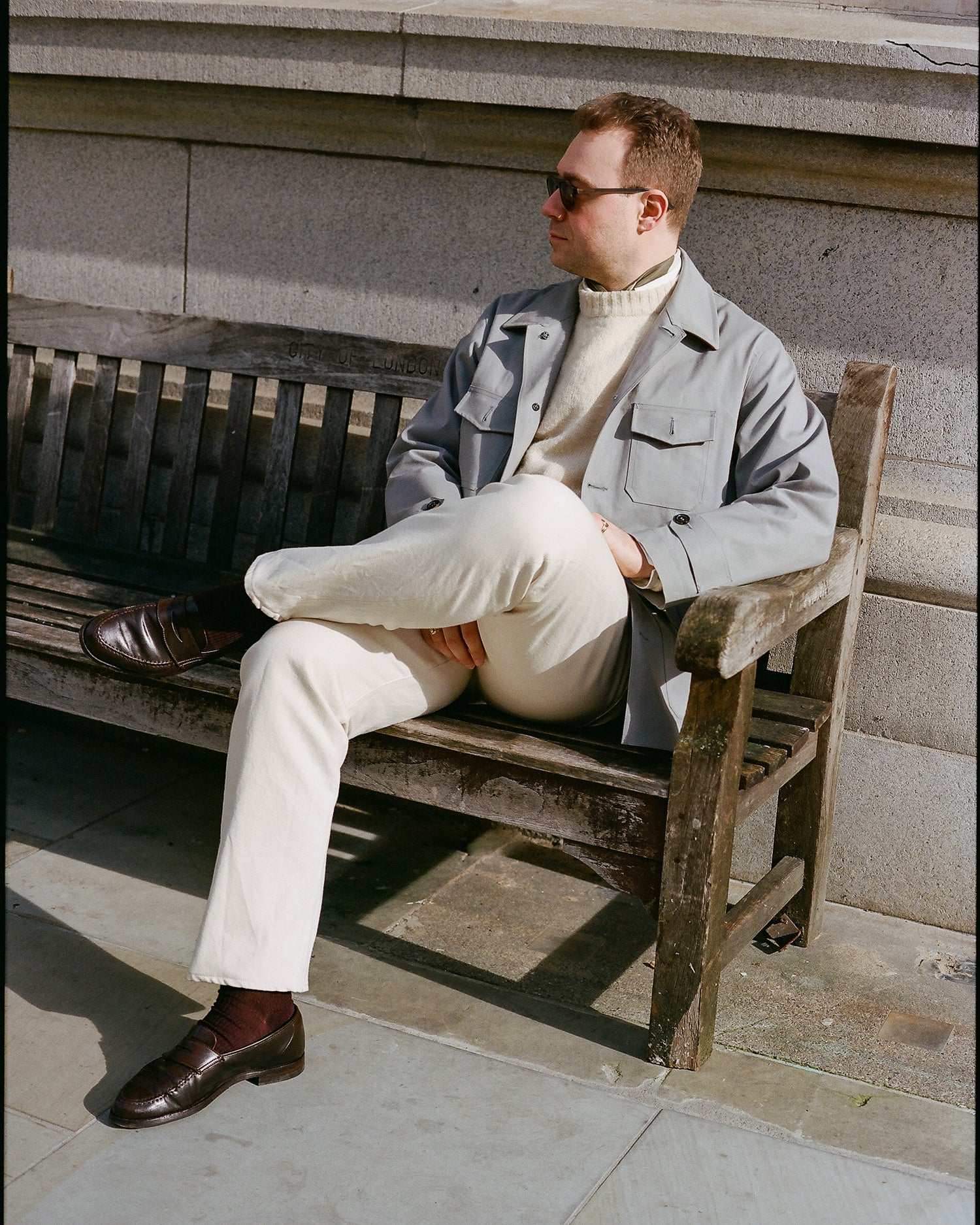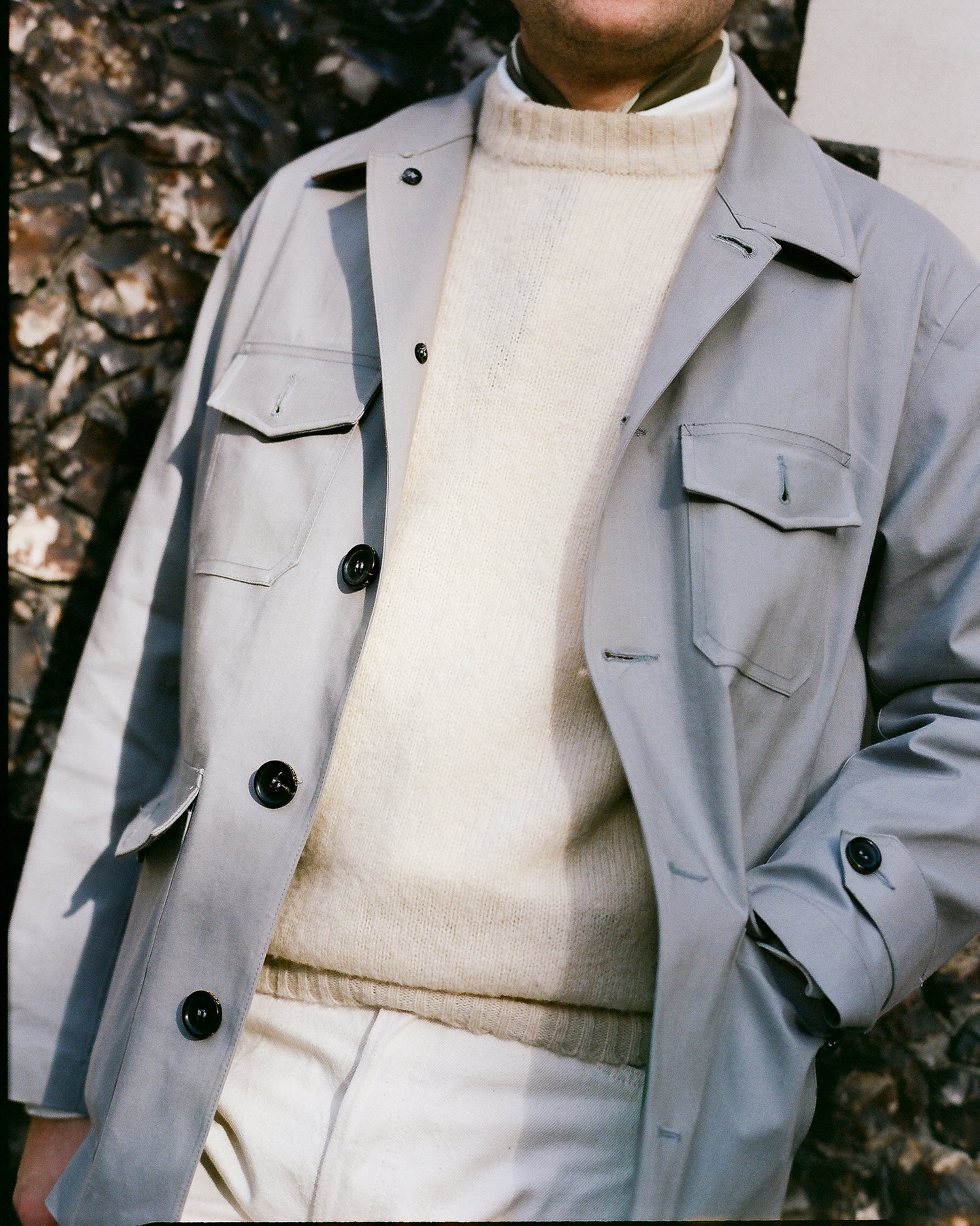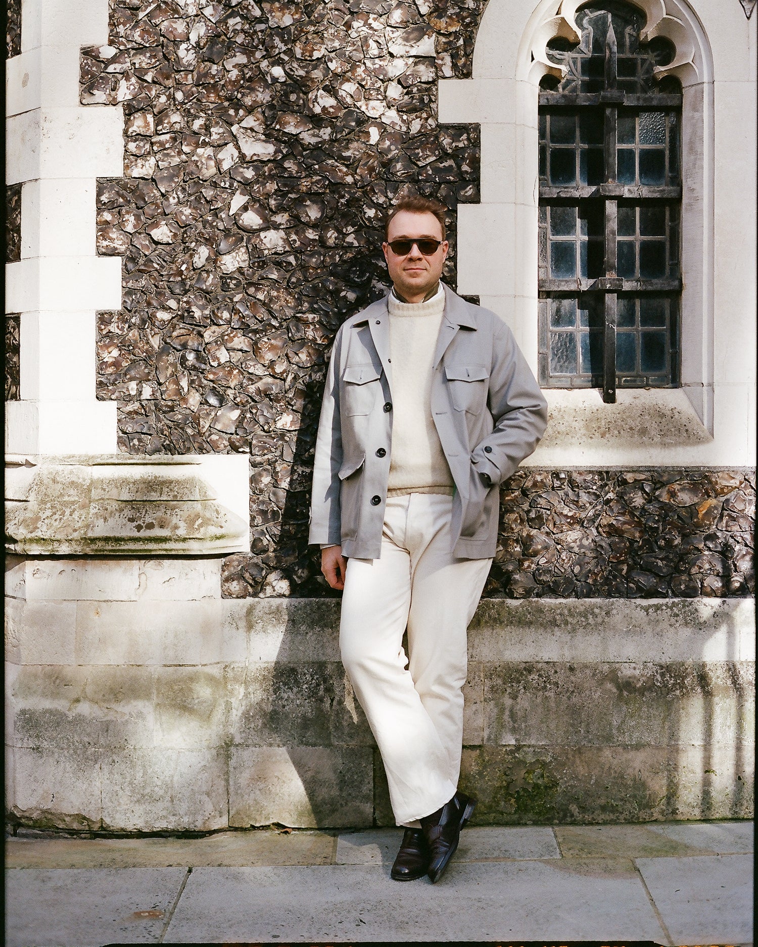 I gravitate towards a controlled colour palette of cream, beige, taupe, browns, greys, charcoal and black. Something in navy or chambray blue comes out to play every once in a while, but warm, natural tones suit me – and they’re deceptively easy to put together. In practice, this can involve pairing ecru jeans with a white shirt and cream Shetland sweater, as seen here, or a black crewneck paired with charcoal whipcord trousers with a plain chocolate brown tweed sports coat over the top.