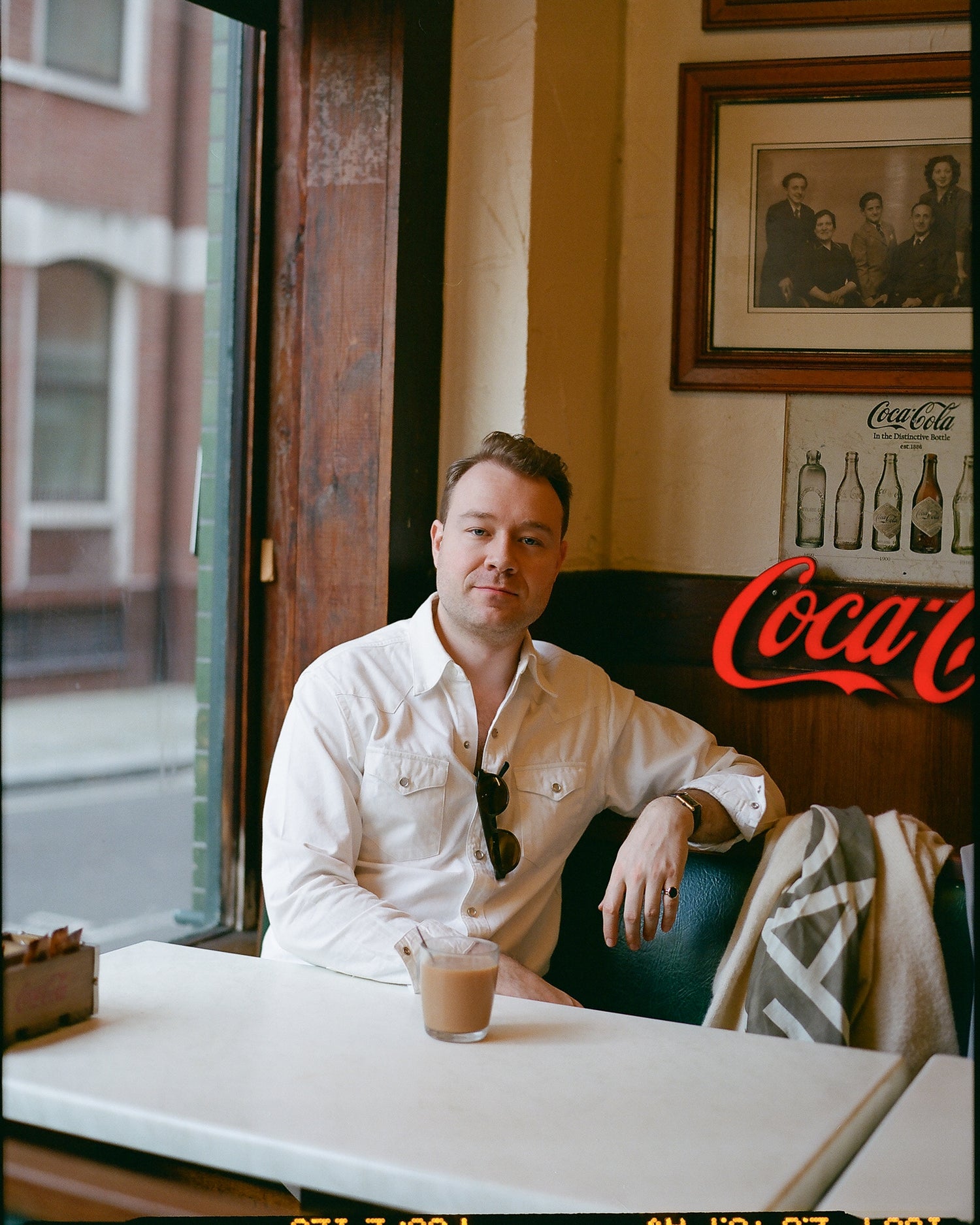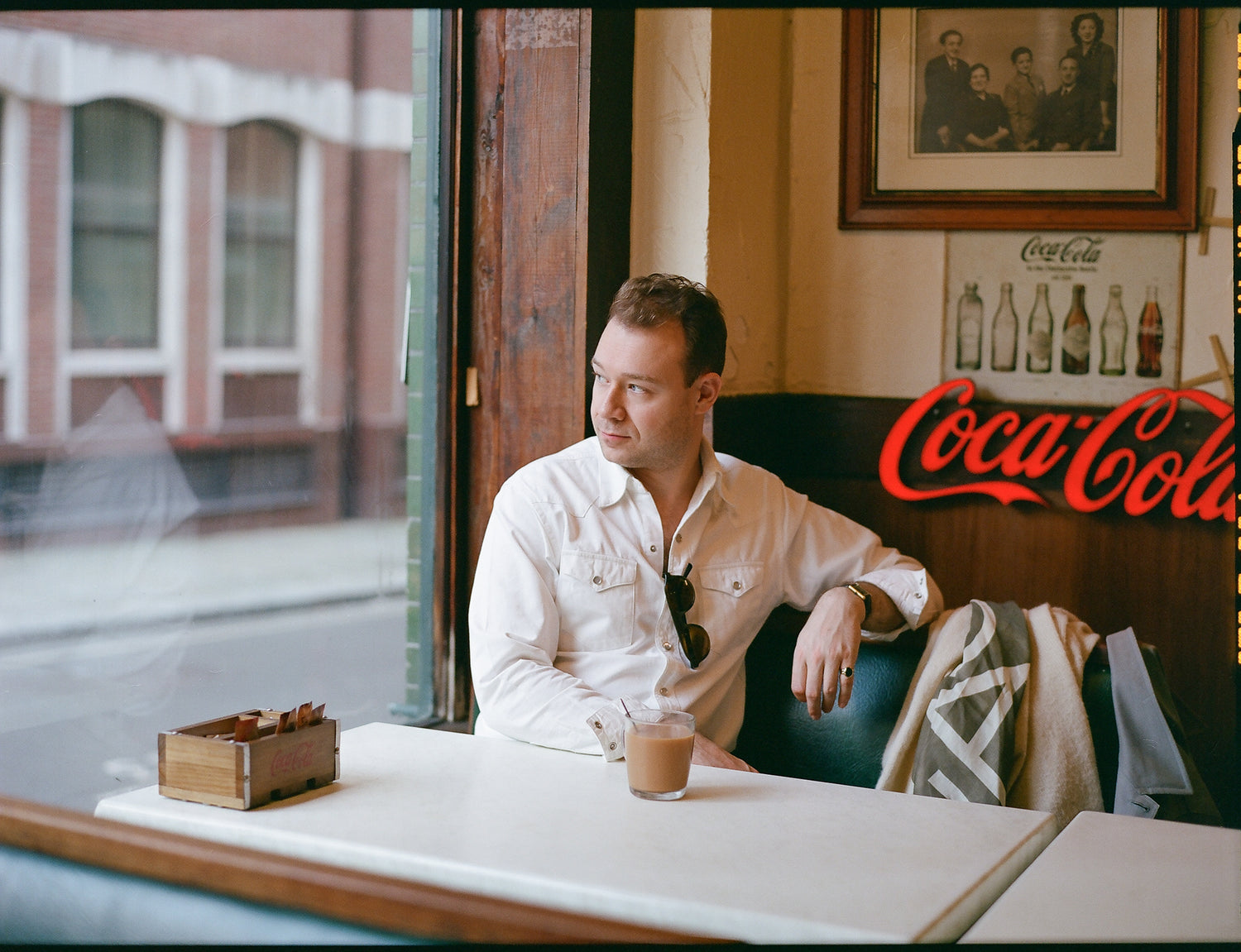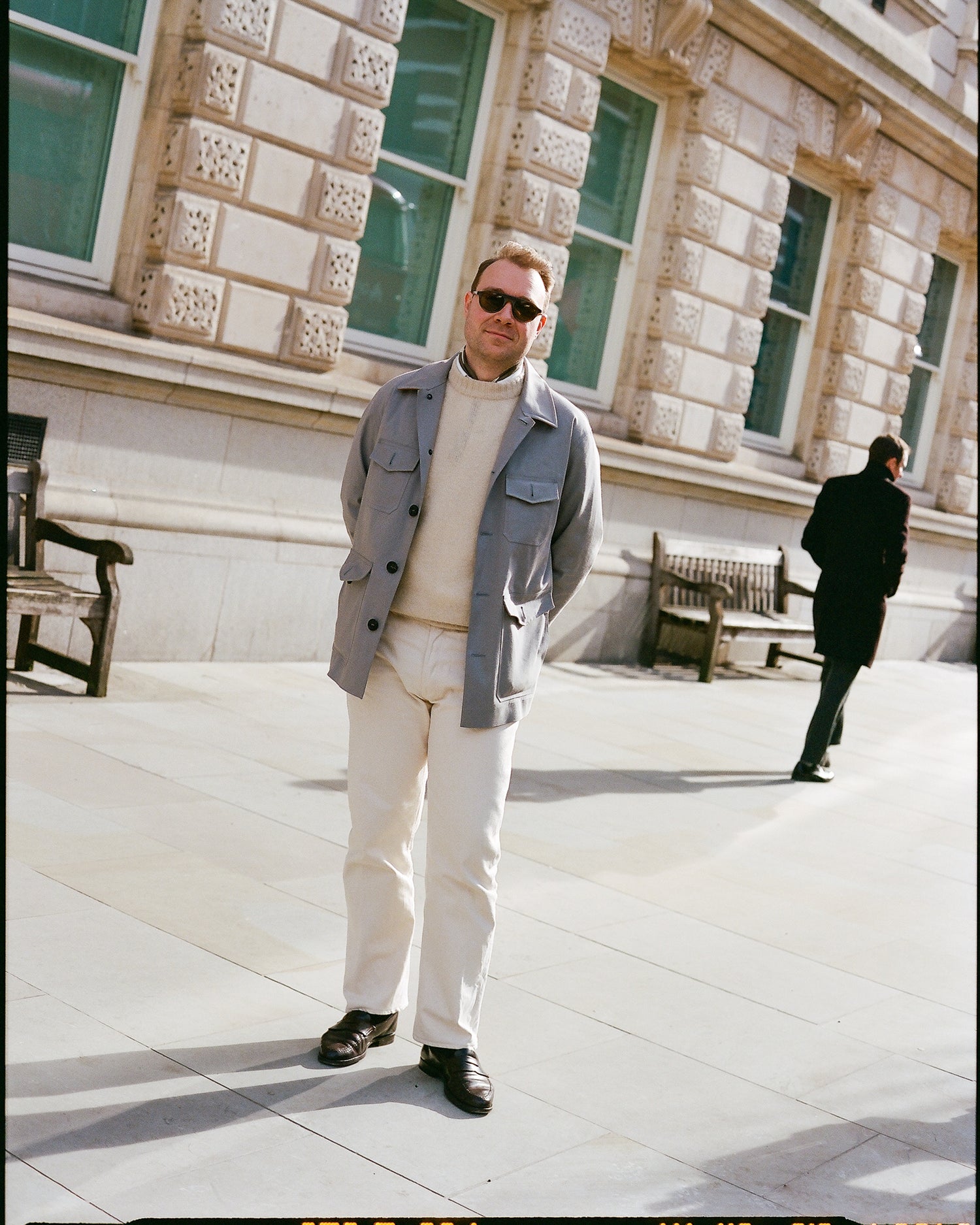 I gravitate towards a controlled colour palette of cream, beige, taupe, browns, greys, charcoal and black. Something in navy or chambray blue comes out to play every once in a while, but warm, natural tones suit me – and they’re deceptively easy to put together. In practice, this can involve pairing ecru jeans with a white shirt and cream Shetland sweater, as seen here, or a black crewneck paired with charcoal whipcord trousers with a plain chocolate brown tweed sports coat over the top.