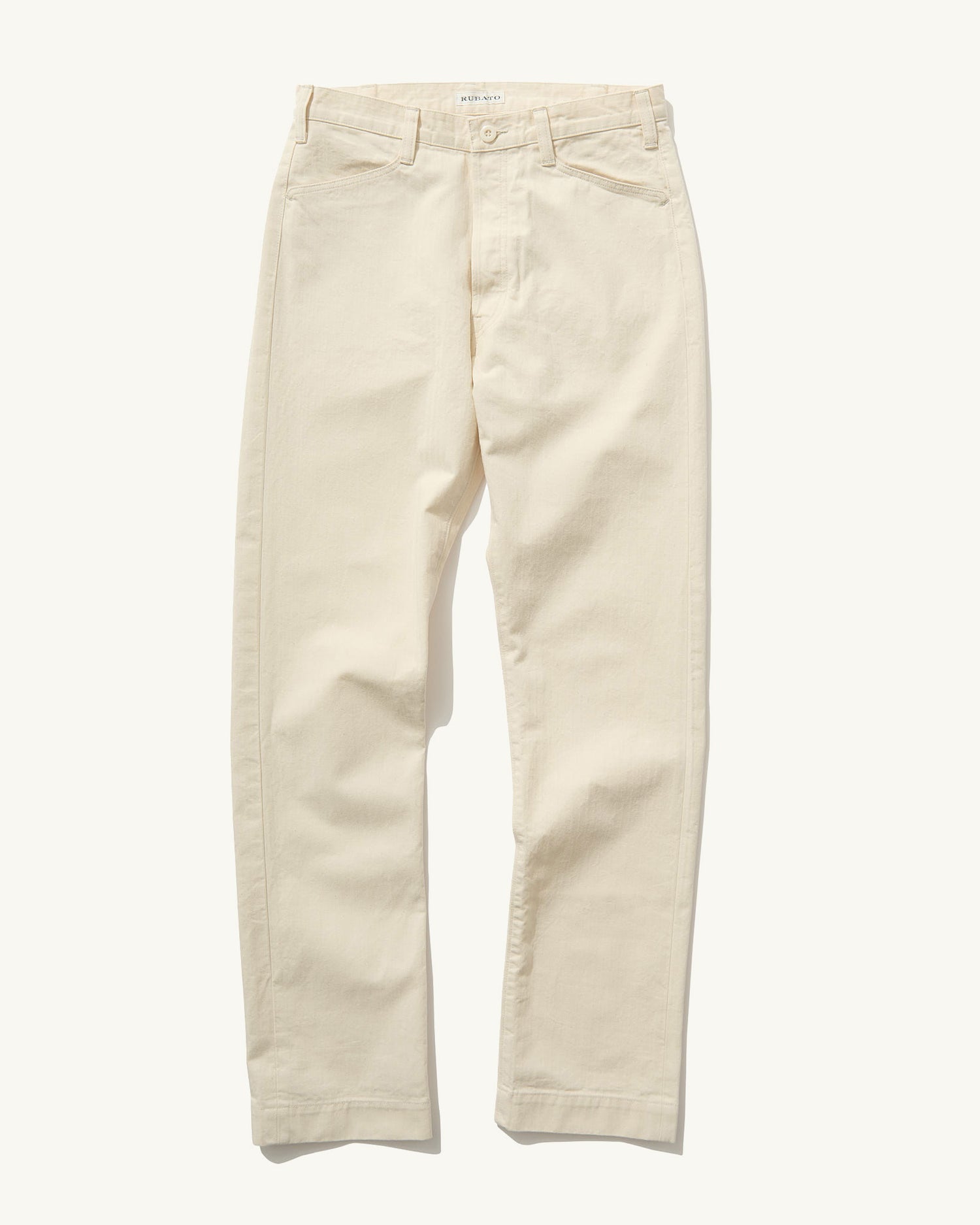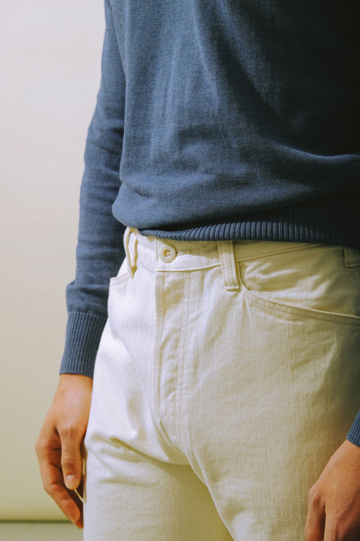 The vintage inspired Resin buttons are present as well as reinforced tabs on all pockets and belt loops. The fabric on the Cream color is natural whereas the Navy colored ones has been yarn dyed with genuine indigo. Expertly made in Japan.