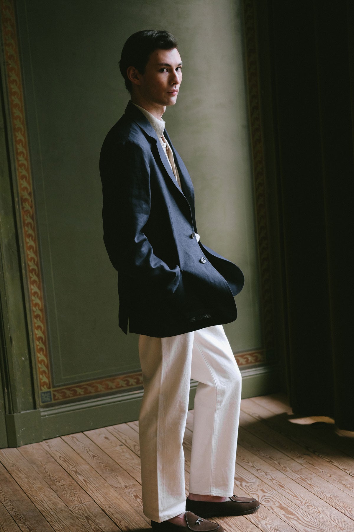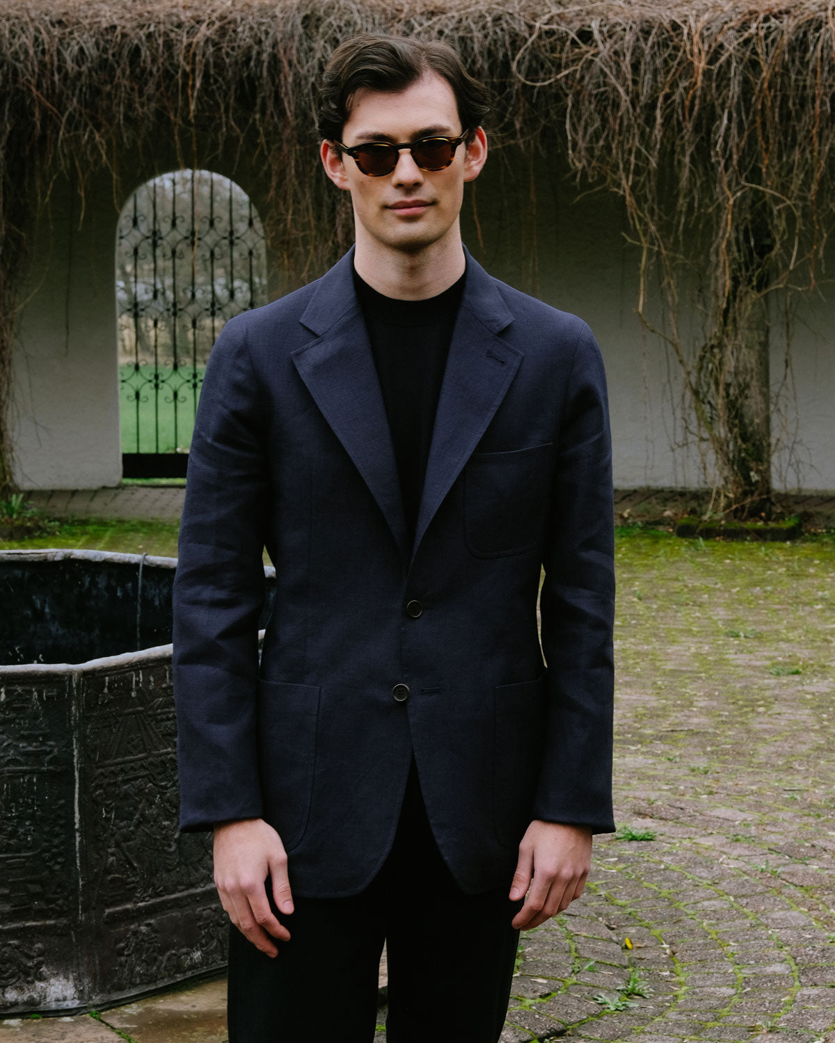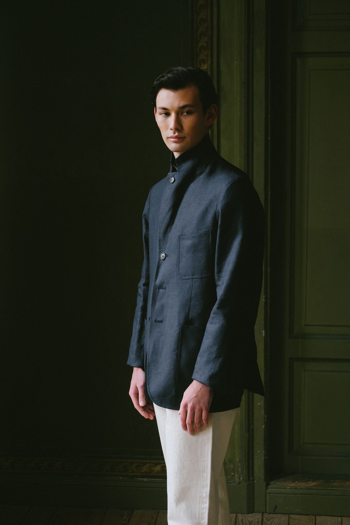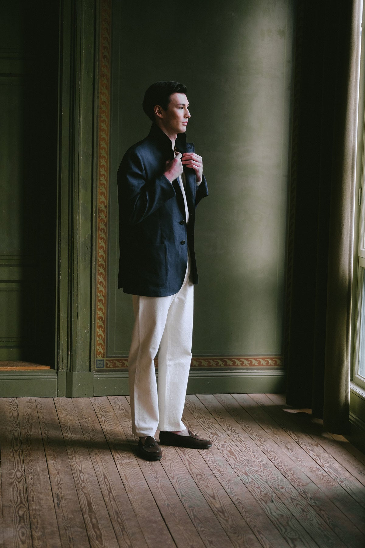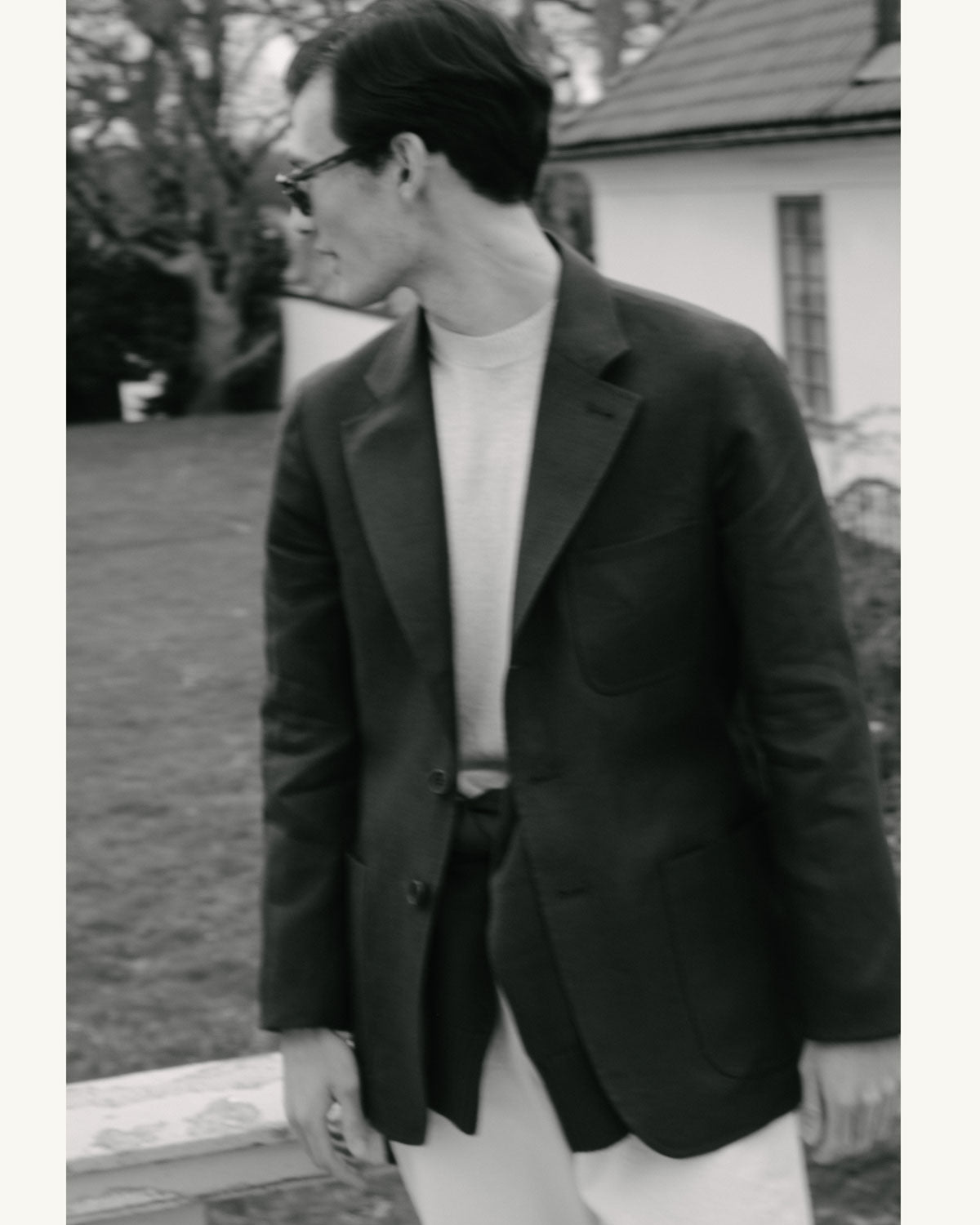 The Rubato Tennis Jacket in linen is not a replica of that era, but a reflection of its values. Light in hand yet defined in shape, it’s made with the same attention to proportion and restraint. The cloth, Irish linen, gives it breathability without fragility, form without fuss. Like Cochet’s game, it conceals control beneath an air of ease.